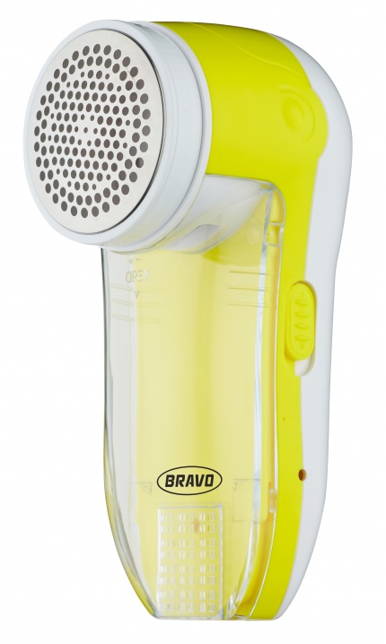 Kvalitní odstraňovač žmolků Bravo B 4633 žlutý s velkým zásobníkem na žmolky a příkonem 5W, napájený ze sítě nebo akumulátoru s náhradním nožem.