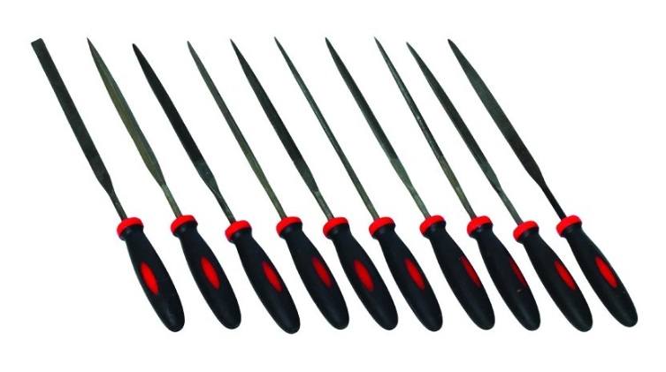 Sada 10 ks jehlových pilníků FESTA 22188 pro jemné broušení. Ergonomická rukojeť z měkčené PTR gumy, různé profily (plochý, kulatý, trojhranný a další).