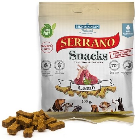 Mediterranean Natural Serrano Snacks, pamlsky delikátně rozkrájené na malé kousky ve tvaru kosti, zaručují bezpečnost vašeho čtyřnohého přítele, přičemž zachovávají všechny živiny, respektují přirozenou stravu a obsahují 70% čerstvého masa.