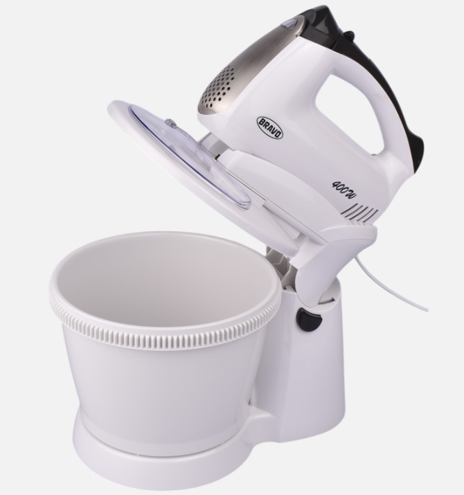 Výkonný šlehač Bravo (400 W) s 1,5l mísou a krytem. Nabízí 5 rychlostí, funkci TURBO a nerezové metly. Ideální pro pohodlné pečení bez nutnosti držení přístroje.