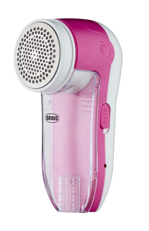 Kvalitní odstraňovač žmolků Bravo B 4633 růžový s velkým zásobníkem na žmolky a příkonem 5W, napájený ze sítě nebo akumulátoru s náhradním nožem.