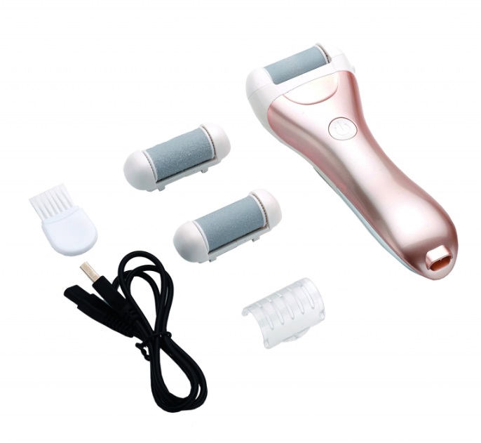 Stylový růžový elektrický pilník Bravo pro hladká chodidla. Nabízí 2 rychlosti, 3 výměnné hlavice, USB nabíjení a LED displej s indikací stavu baterie.