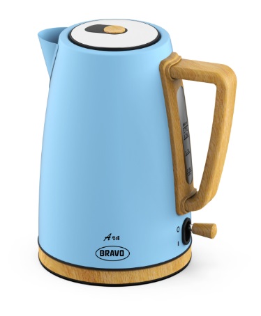 Designová nerezová konvice BRAVO Ara v kombinaci světle modré barvy a imitace dřeva. Objem 1,7 l, špičkový konektor STRIX a příkon až 2200 W.