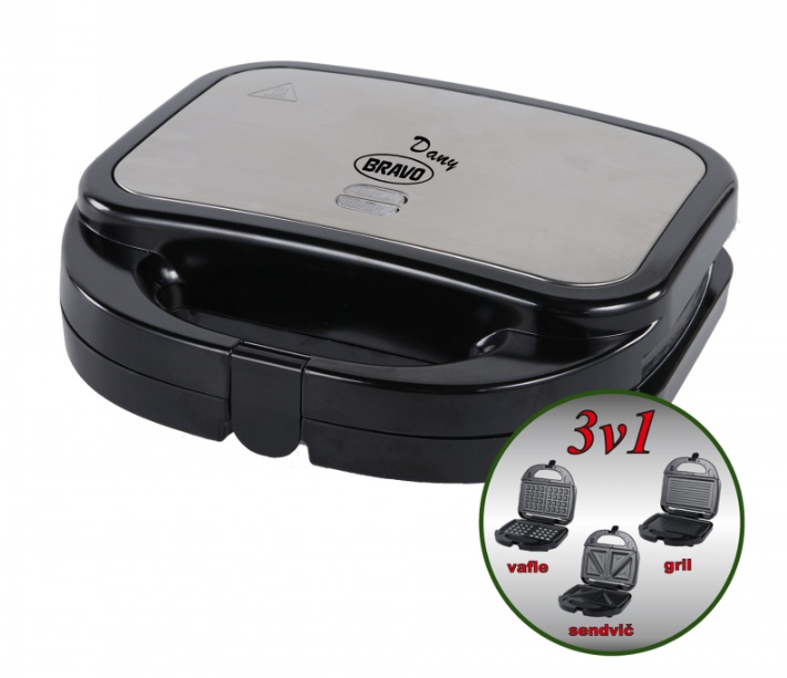 Multifunkční nerezový sendvičovač Bravo (3 v 1). Obsahuje výměnné plotny na sendviče (trojúhelníky i čtverce), vafle a gril. Nepřilnavý povrch a příkon 700 W.