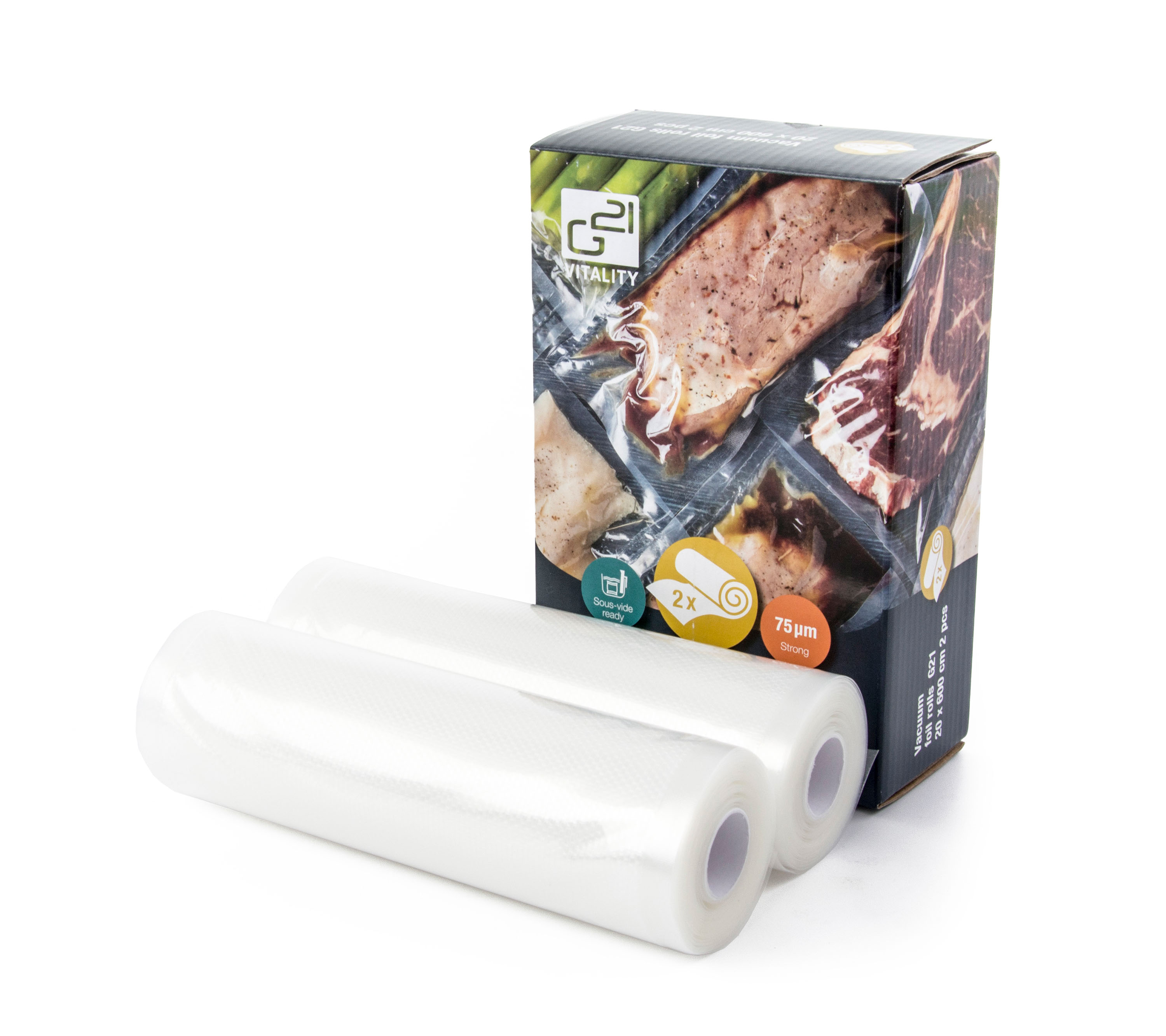 Velkou předností vakuovací fólie G21 v roli je jak použitý zdravotně nezávadný materiál, tak i pevný a poctivý široký svár. Díky tomu máte jistotu, že se fólie při použití nerozpojí a zavakuované potraviny můžete bez obav zpracovat sous-vide vařením. Zároveň získají delší trvanlivost při uskladnění v chladničce nebo mrazáku.