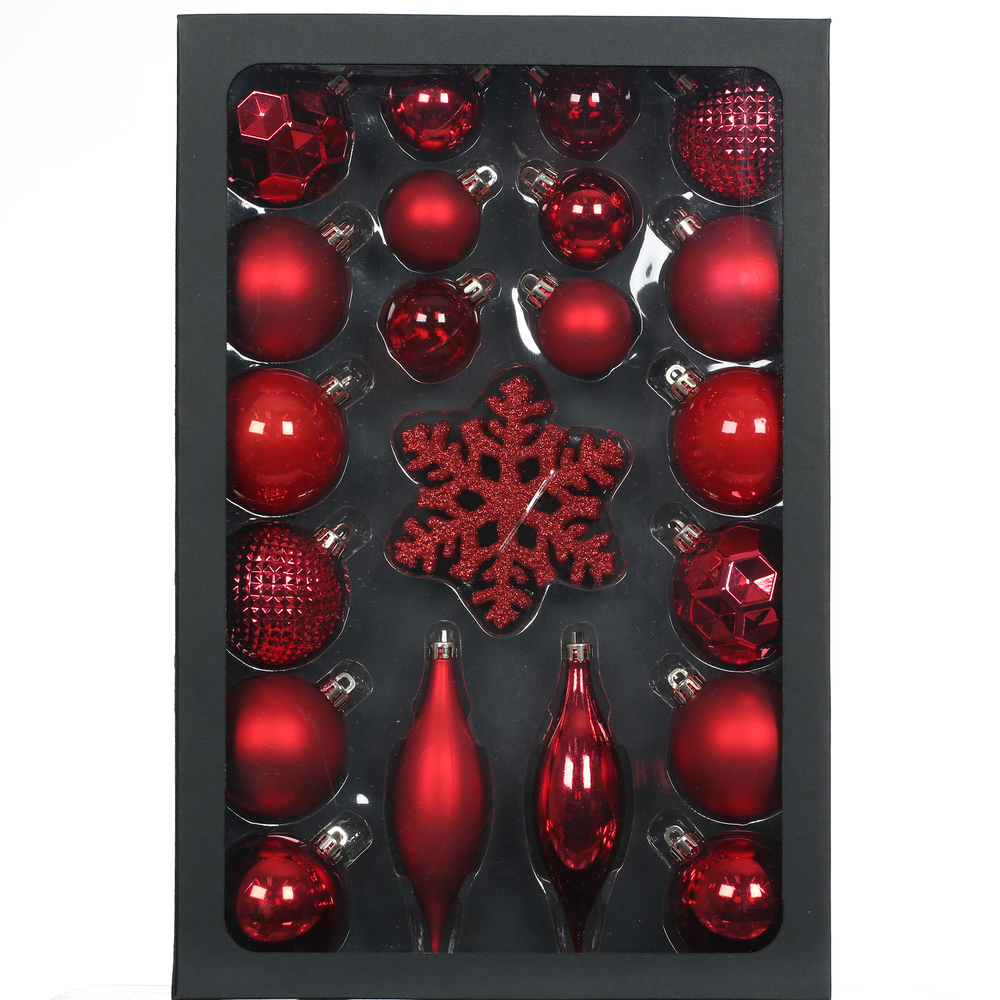 Sada 25 kusů vánočních ozdob v tradiční červené barvě.