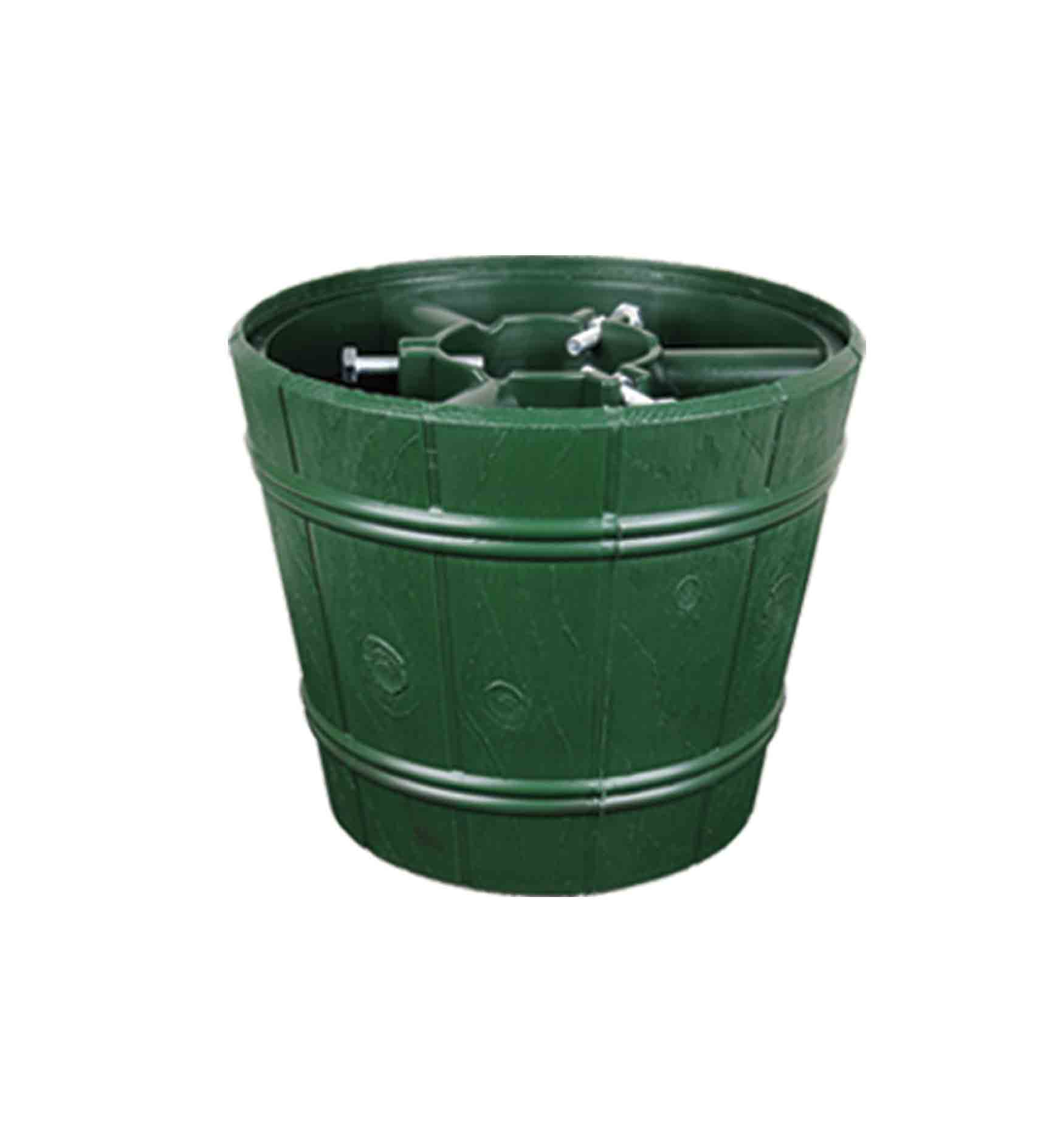 Kvalitní plastový stojánek na stromeček má hezký tvar vědra s imitací dřevěné textury.