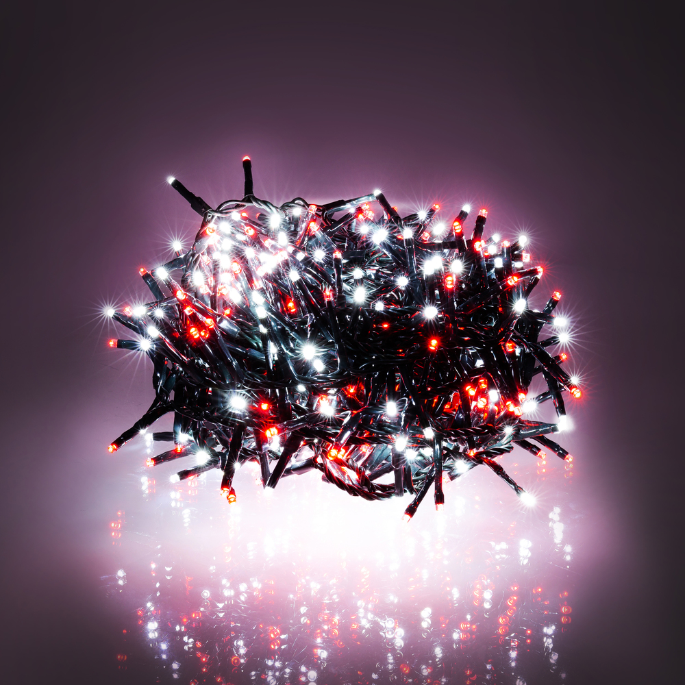 Vánoční řetěz - ježek 600LED barva bílá studená a červená, délka osvětleného kabelu 11m.
