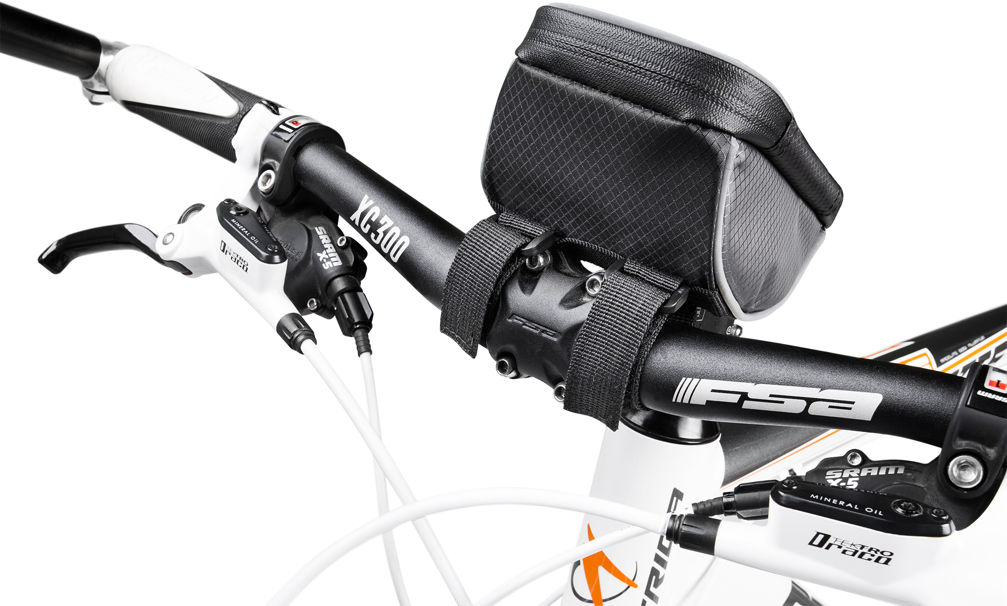 Držák telefonu na řídítka kola s úložným pouzdrem pro malé příslušenství.