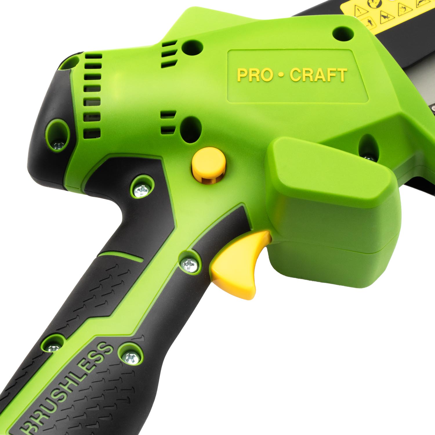 Kompaktní jednoruční aku pila Procraft pro prořezávání stromů a keřů. Tichý chod, bezpečnostní kryt řetězu a nízká hmotnost. Verze bez baterie a nabíječky.