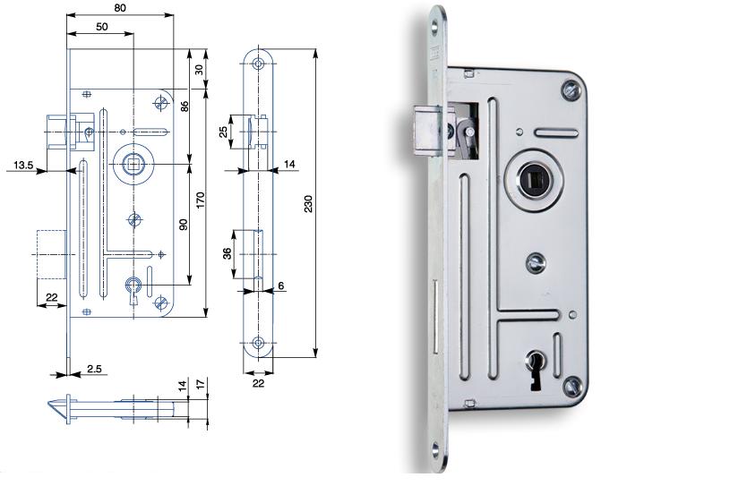 Zadlabací zámek Hobes 02-03 P-L s roztečí 90mm a zádlabem 60mm, dozický, bez převodu, jednozápadový.