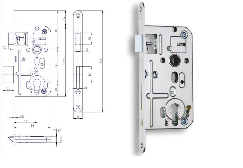 Zadlabací vložkový cylindrický zámek HOBES K 133 P-L s roztečí 72mm, hloubkou 80mm, osovou vzdáleností 50mm a šířkou štítu 20mm.