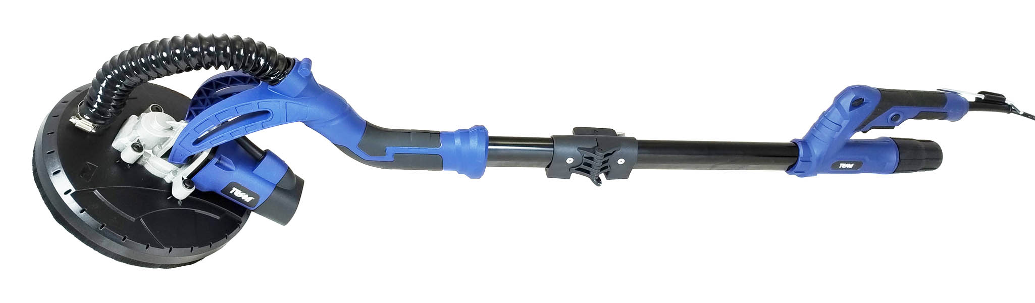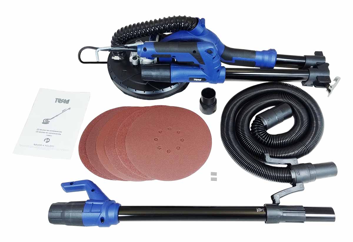 Výkonná bruska „žirafa“ TUSON (600 W) pro broušení stěn a stropů. Teleskopická tyč (až 165 cm), regulace otáček, odsávání a bohatá sada brusných papírů v kufru.