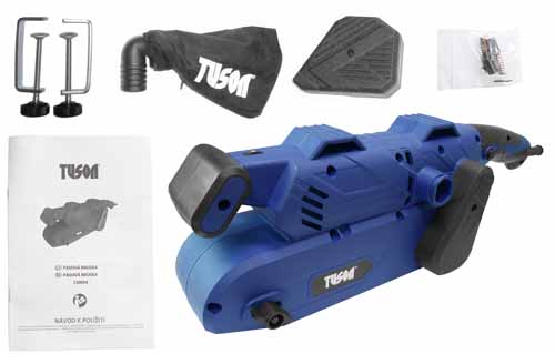 Výkonná pásová bruska TUSON (900 W) s regulací rychlosti pásu. Rozměr 533×76 mm, prachový box a možnost uchycení k pracovnímu stolu jako stacionární bruska.