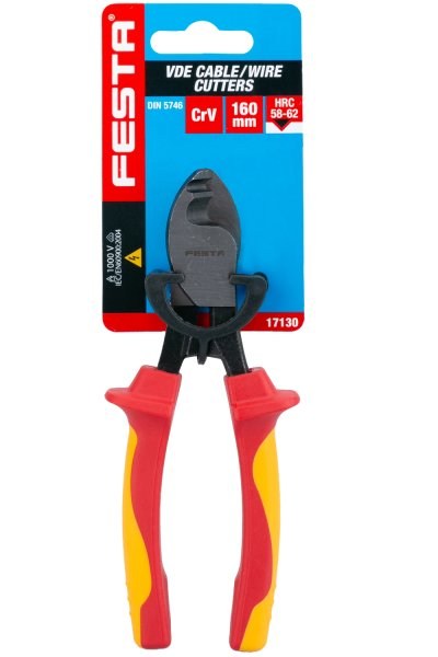 Kabelové štípací kleště FESTA 17130 VDE 160mm z CrV oceli mají certifikaci do 1000 V a odolné protiskluzové rukojeti pro bezpečnou práci s vodiči.