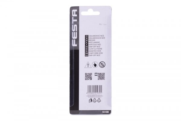 FESTA 16100 nabízí odlamovací nůž s kovovou lištou a automatickou aretací s pojistkou, který umožňuje uložení až tří náhradních břitů přímo v těle nástroje