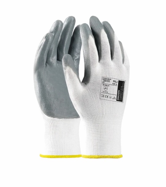 Olejovzdorné rukavice Nitrax Basic vel. 10. Polomáčené v šedém nitrilu, bílý polyesterový úplet. Vysoká odolnost proti oděru (4). Norma EN388: 4131X.