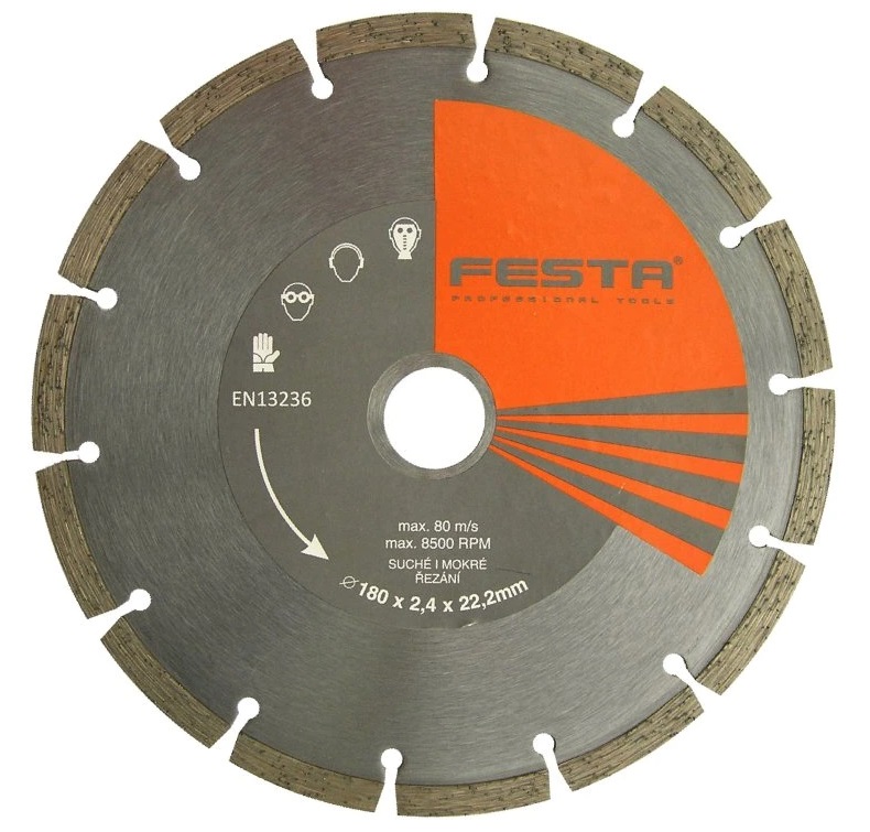Profesionální diamantový kotouč FESTA, provedení : SEGMENTOVÝ, kvalitní materiály i zpracování - vysoce pevné uchycení diamantových segmentů k nosnému disku kotouče, vysoký obsah diamantového prachu v segmentech,