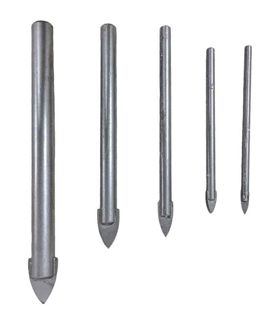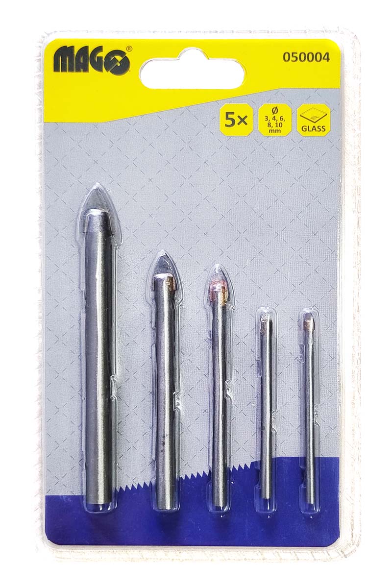Specializovaná sada 5 ks vrtáků na sklo, zrcadla a měkkou keramiku. Průměry 3, 4, 6, 8 a 10 mm. Karbidové ostří ve tvaru kopí pro dokonale čisté otvory.
