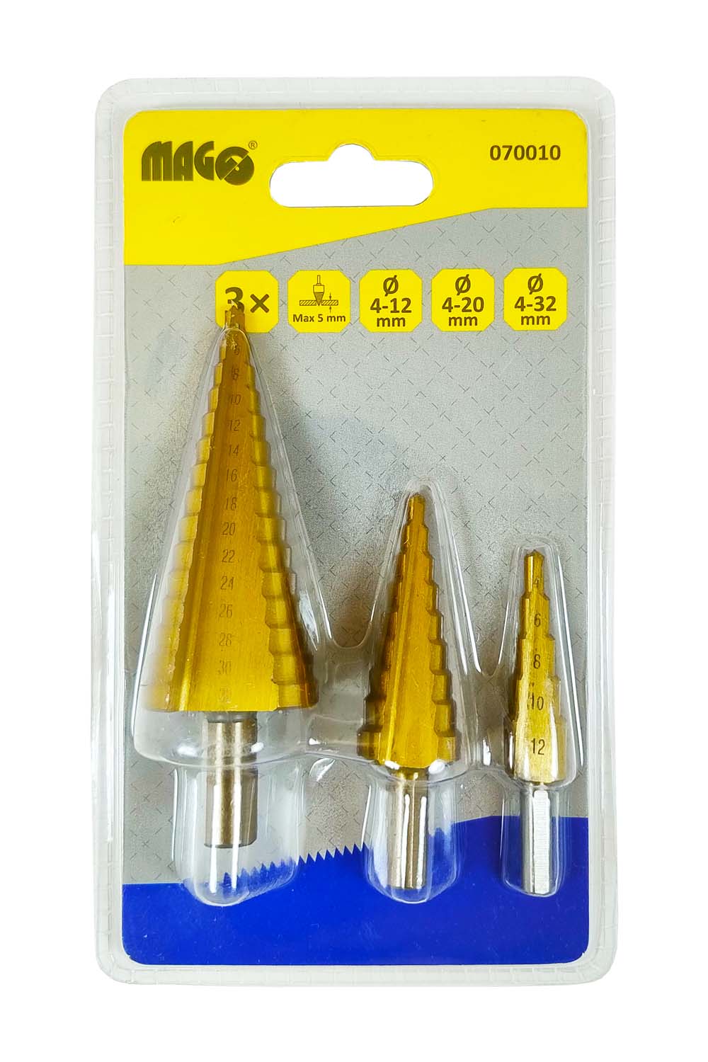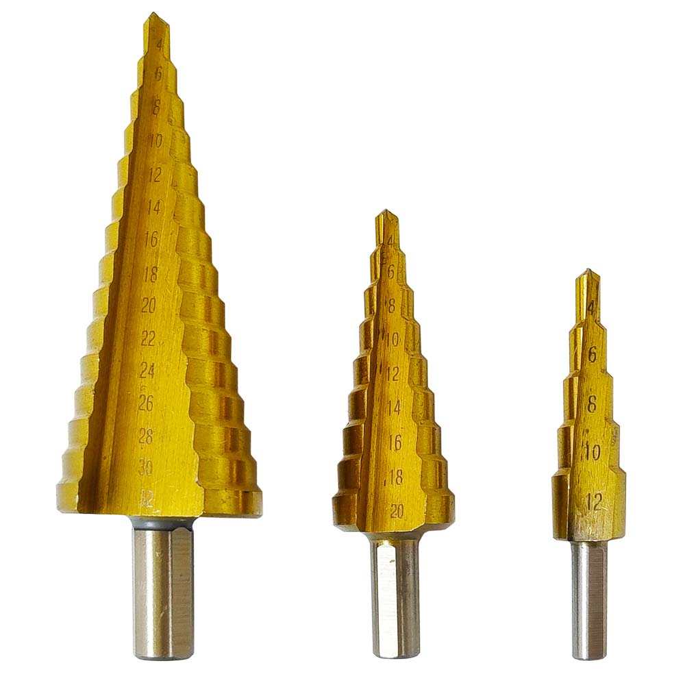 Sada 3 ks stupňovitých vrtáků z oceli HSS 4241 s titanovým povrchem. Rozsah 4–32 mm. Ideální pro čisté vrtání do plechů a plastů do tloušťky 5 mm.